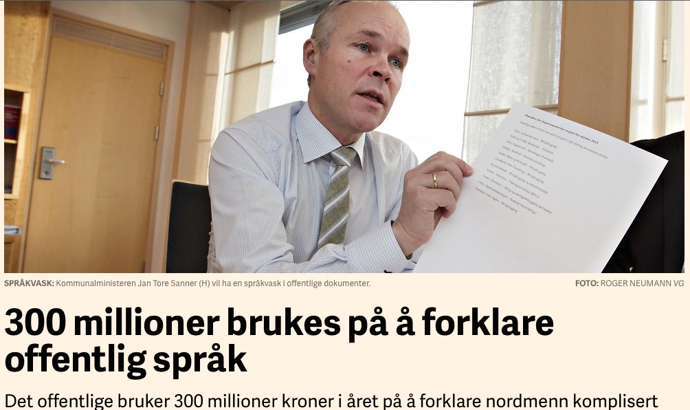 "Det offentlige bruker 300 millioner kroner i året på å forklare nordmenn komplisert byråkratispråk. Kommunalminister Jan Tore Sanner (H) gir 1 million kroner til språkvask", ifølge E24. 31.04.2014.