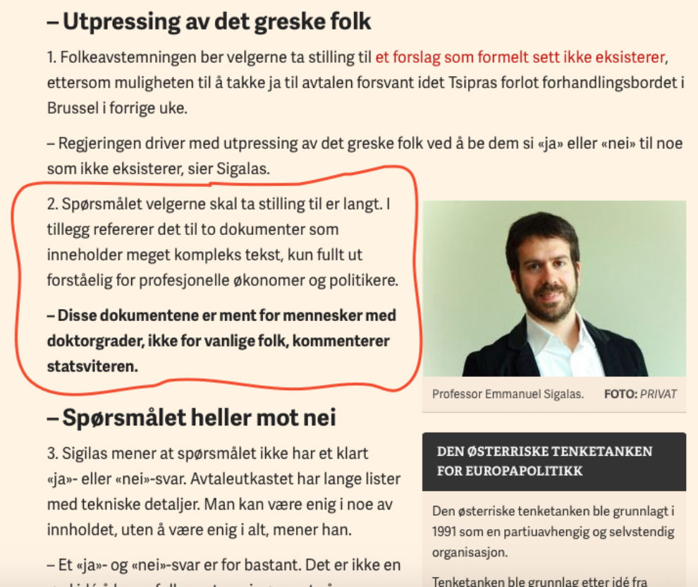 e24.no: Det refereres til to dokumenter som inneholder meget kompleks tekst. Teksten er kun fullt ut forståelig for mennesker med doktorgrader, ikke for vanlige folk. Det er professor Emmanuel Sigalas i den østerriske tenketanken for europapolitikk som slår det fast.