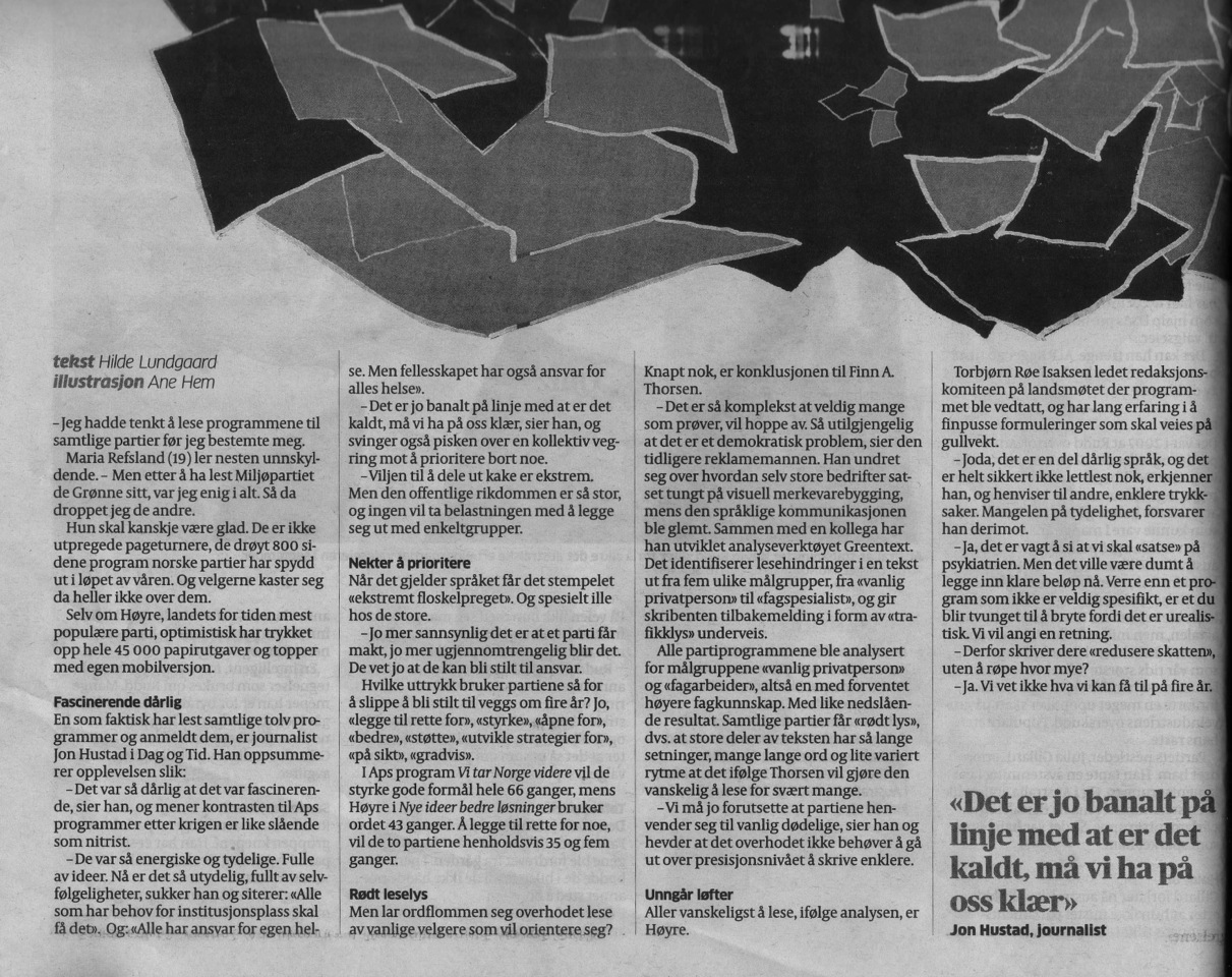 I artikkelen vises det også til Greentext. Måleverktøyet har analysert hvorvidt programmene er lesevennlige eller ei. Alle analyser av løpende tekst viser rødt. Veien synes derfor lang til grønne, lettleste programmer. Snarere synes det som skribentene har skrevet til seg selv. Det er derfor betimelig å spørre hvorfor samtlige partiprogrammer er publisert?