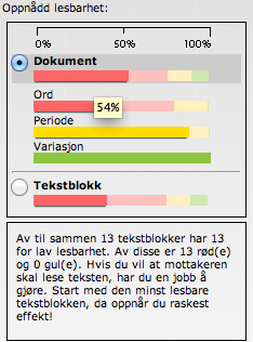 I det øvre feltet viser en indikator-søyle, merket "Dokument", status for hele dokumentet. I det nedre feltet vises et antall indikatorene. Hver av dem speiles i en tekstblokk i tekstfeltet. Plasserer du pekeren over en av indikatorene i et av de to feltene, får du vite eksakt oppnådd lesbarhet målt i prosentpoeng.